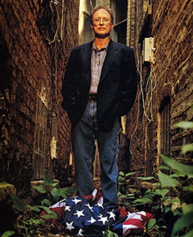 This 2001 photo (on the left) appeared on the cover of Chicago Magazine showing Ayers standing on America's flag, safely down some alley. This photo vividly explains everything needed to understand everything about this festering putrid diseased puke, and his master, Bill Ayers.